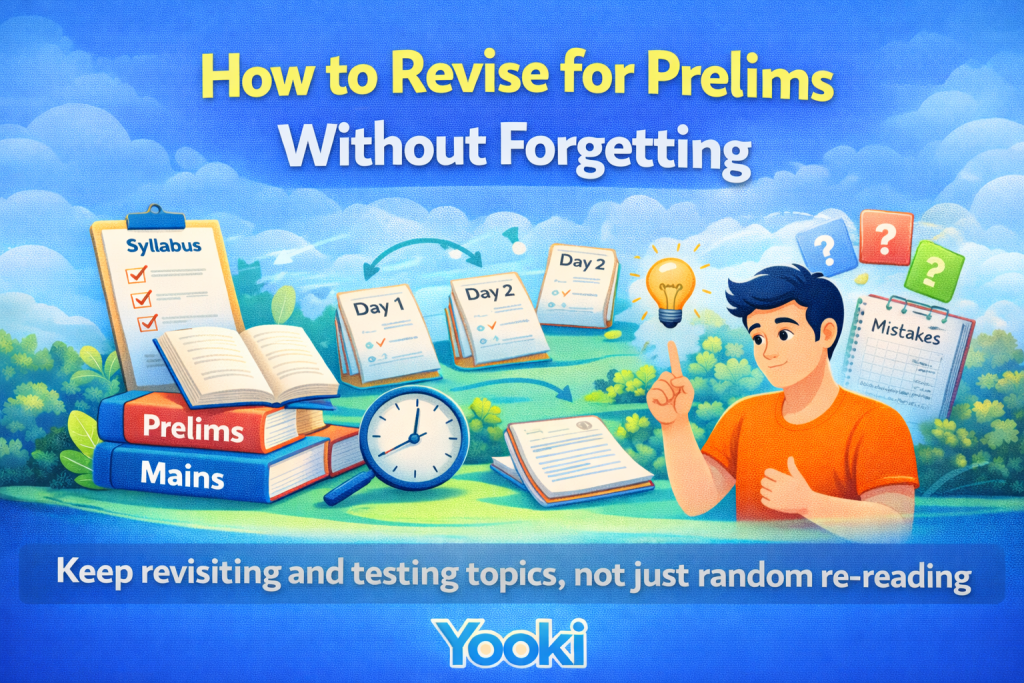 To revise effectively for Prelims, focus on repeated cycles instead of one-time reading. Revision works when you revisit the same topics multiple times at short intervals. This strengthens retention and improves recall under exam pressure.